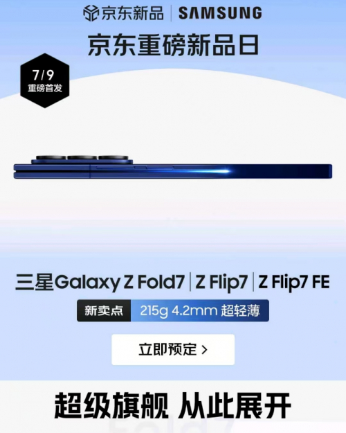 7月9日,三星Galaxy全球新品发布会正式发布三星Galaxy Z Fold7、Z Flip7、Z Flip7 FE。为满足用户第一时间到手新机的需求,京东携手三星提供新品先人一步抢先发权益,现在来京东提前预定尝鲜,可享7月22日优先发货。此外,用户预定三星Galaxy Z Fold7、Z Flip7还可享256GB免费升杯至512GB。其中,三星Galaxy Z Fold7售价13999元起,学生用户在京东下单可再减100元。此外,下单用户还可享1年只换不修、1年延保、野兽派香薰、飞利浦保温杯、新秀丽钥匙包权益随心选5选1。