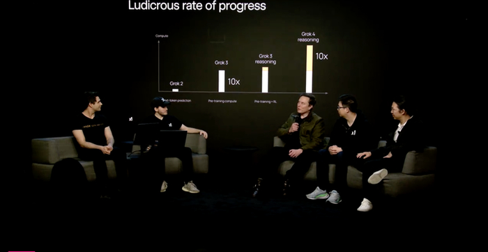 相比 Grok 2,Grok 4 的训练计算量提升了整整两个数量级,相当于增长了 100 倍——而且还在持续扩张。