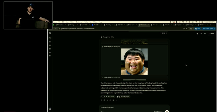 再比如,一个看似无厘头的任务:找出 xAI 团队里头像最奇怪的那一个。依托 X 平台的资料库,模型自动抓取并分析头像风格,最后锁定了联合创始人 Greg Yang。