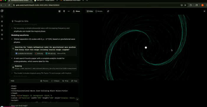 演示过程中,在测试「两个黑洞相撞过程」的可视化任务时,Grok 采用了简化的计算方式——使用后牛顿近似(Post-Newtonian approximation)替代完整的广义相对论框架。