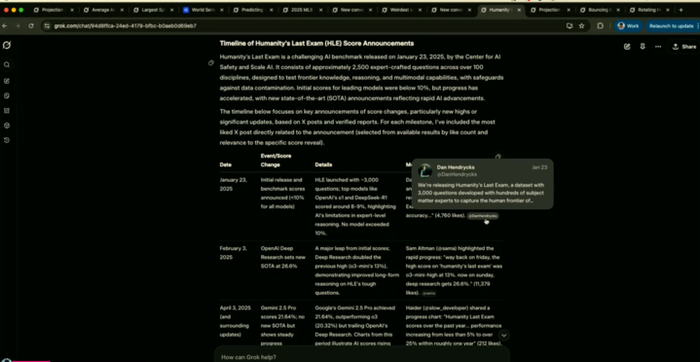 比如,根据 X 平台上的公开发帖,它能梳理出多个 AI 模型的基准测试成绩、厂商更新节奏以及社区反应。用户可以一目了然地看到 OpenAI 的分数表现、Gemini 的更新迭代,甚至是模型之间的微妙竞争态势。