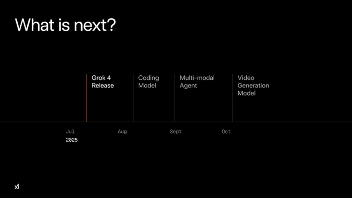 Grok 4 不是终点。发布会最后预告了接下来的路线图,每一项都非常值得期待。