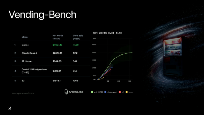 比如,在一项自动售货机商业模拟 Vending-Bench中,Grok 被要求自主完成:供应商协商、库存管理、定价策略,连续完成并长期保持盈利。