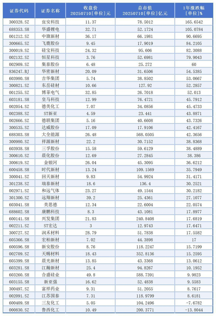 其中,宜安科技、华盛锂电、中旗新材、飞鹿股份、硅宝科技、恒星科技、集泰股份、华密新材、吉华集团、东岳硅材、博菲电气11家上市公司涨幅超过50%。