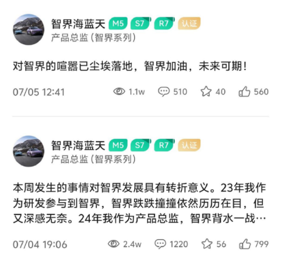 鸿蒙智行智界系列产品总监海蓝天日前的发声也从侧面印证了这一分析。7月4日和5日,他在鸿蒙智行App中接连发文称:“本周发生的事情对智界发展具有转折意义。23年我作为研发参与到智界,智界跌跌撞撞依然历历在目,但又深感无奈。24年我作为产品总监,智界背水一战后面的矛盾冲突让人心有余悸。本周之后,智界可以全力向前奔跑!感谢智界车主对智界的厚爱和支持,让我们一同陪着智界成长!”“对智界的喧器已尘埃落地,智界加油,未来可期!”