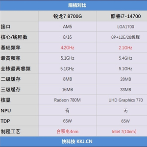 虽然2款处理器TDP都是65W,但锐龙7 8700G采用的是台积电4nm制程工艺,而i7-14700则是Intel 7制程工艺(实际是10nm增强版),相差整整2代。
