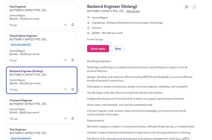 迁往新加坡后,Manus的招聘节奏也明显加快,虎嗅根据亚洲最大招聘网站JobStreet发布的职位上看,Manus的母公司蝴蝶效应(英文名称为:Butterfly effect PTE.LTD),在过去一个月时间里,在该网站上共发布了14个职位,包括在线邮件回复客服、用户体验设计师、Agent工程师、AI应用工程师、数据库工程师等,薪资最高达到14000美元。薪资约为国内同类岗位的3倍。此前,Manus在国内发布的招聘岗位,最高薪资为5万人民币。