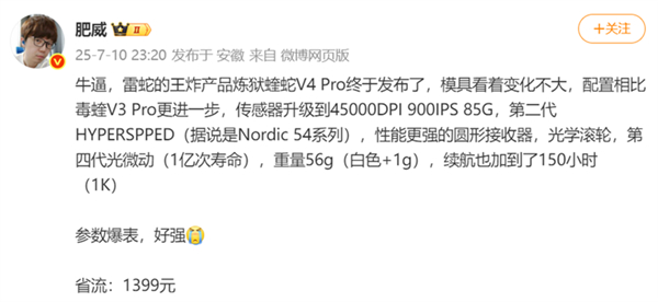 根据数码博主 @肥威的爆料,外形变化不大,配置相比毒蝰V3 Pro更进一步,传感器升级到45000DPI 900IPS 85G,第二代HYPERSPPED,性能更强的圆形接收器,光学滚轮,第四代光微动(1亿次寿命),重量56g(白色+1g),续航也加到了150小时(1K)。