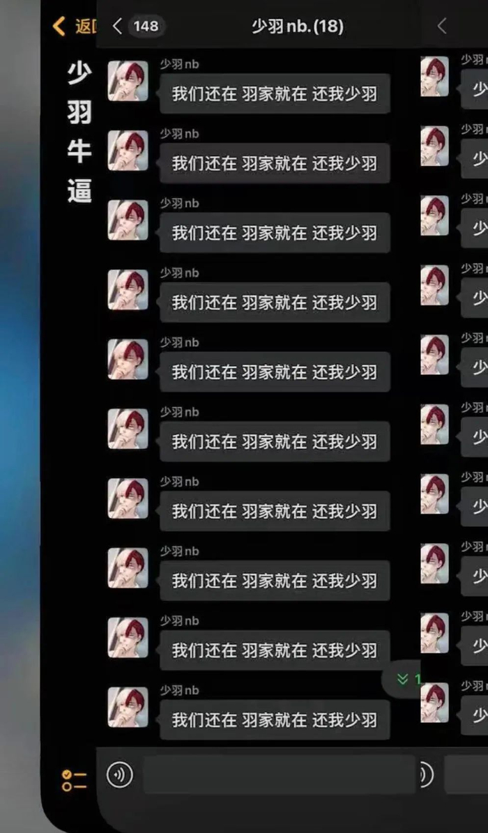 自封号的讯息传来,“羽家军”火速涌入短视频平台的各个直播间,只要发一句“少羽牛逼”,就有同盟跟着接龙到天荒地老。