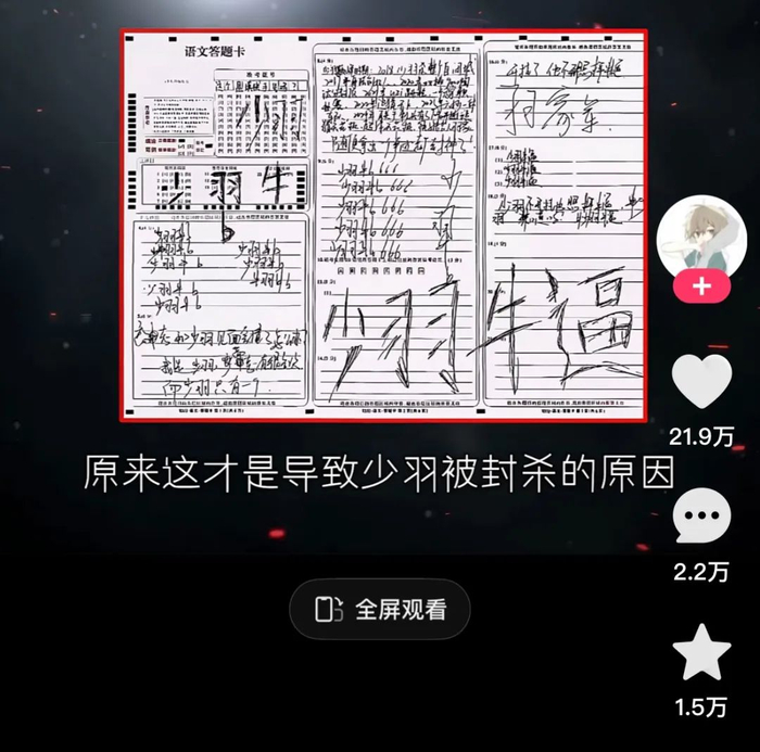 因为前一阵恰好有这么件事:在各大考试期间,一部分少羽粉丝出现了在答题卡上写“少羽牛逼”的举动。