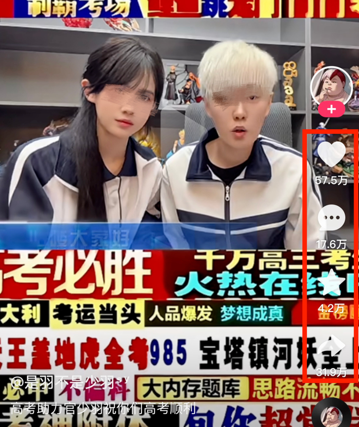 更讽刺的是,少羽账号的最后一条视频,还是一条专为考生录制的祝福,而也正是这条“最正能量”的内容,迎来了最猛烈的注视: