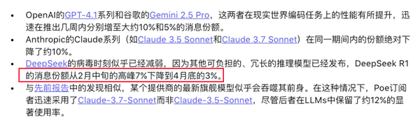 在 AI 模型平台 Poe 的报道上可以看到,在即使是年初最火的时候,DeepSeek 的使用率,也只有大概百分之六七左右。