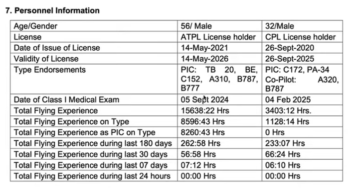 副驾驶年仅 32 岁,持有 CPL 飞行执照,总飞行时长 3403 小时,其中在 B787 飞机上飞行 1128 小时,无机长飞行经历。两人均持有有效飞行执照,身体状况良好。