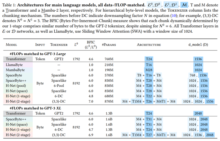 实验中,本文采用的主要语言模型架构如下所示,如 MambaByte 是使用纯 Mamba-2 层的各向同性模型。