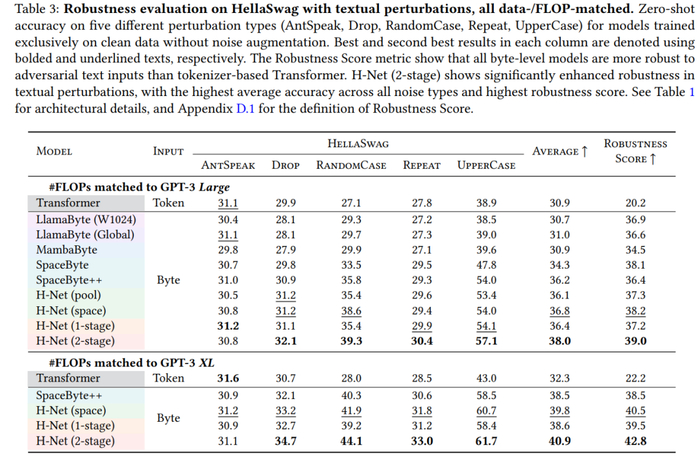 表 3 评估了模型在 HellaSwag 上的鲁棒性。与所有基准模型相比,H-Net(2-stage)显著提高的鲁棒性。