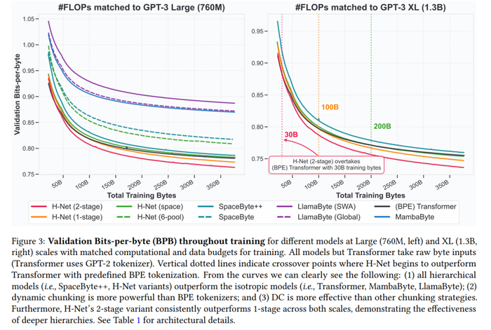 H-Net 代表了第一个真正的端到端、无 tokenizer 的语言模型:通过一个动态分块阶段,字节级的 H-Net 在超过 10 亿参数的规模下,达到了与强大的 BPE token 化 Transformer 相当的困惑度和下游性能。