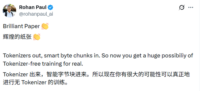 「这一研究预示着 Tokenizers 正在退场,智能字节分块(Smart Byte Chunks)开始登场。或许无需 Tokenizer 训练的时代真的要来了 —— 可能性无限大。」X 知名博主 Rohan Paul 表示道。