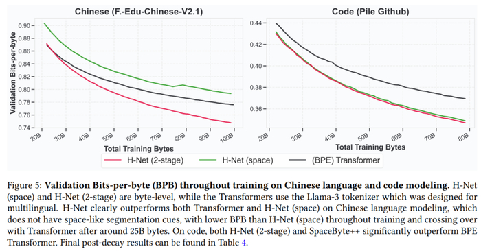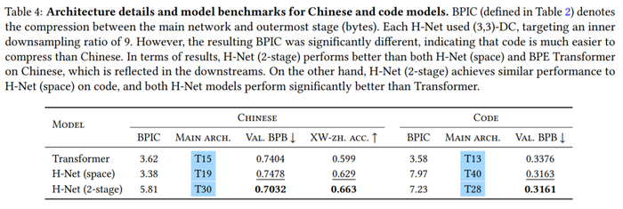即使使用 Llama3 tokenizer,本文发现 H-Net(2-stage)在中文和代码处理上,比 BPE Transformer 和 H-Net(space)具有更好的扩展性(图 5),并且在衰退阶段后实现了更低的压缩率(表 4)。