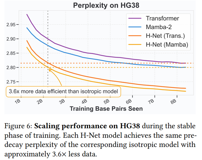 实际上,通过直接比较训练稳定阶段的困惑度曲线(图 6),本文发现 H-Net 模型在数据量仅为 3.6 倍的情况下,能够达到与各向同性模型相似的性能,这一发现适用于两种主网络架构的选择。