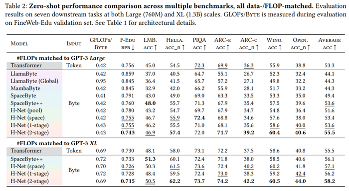 SpaceByte++、H-Net(space)和 H-Net(1-stage)在大规模上与 BPE Transformer 的性能相似,在 XL 规模上稍微超越了 BPE Transformer。
