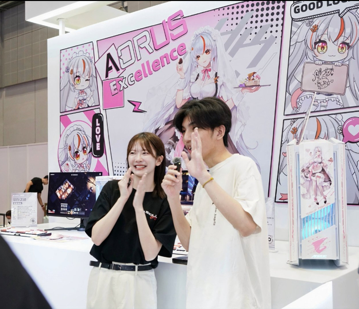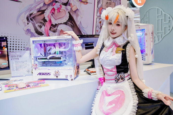 由AORUSB850M主板搭配技嘉破空C201机箱打造的耀白之境展区,萌萌的女仆雕妹忍不住和自己的次元形象近距离合影。就连前TEC.Blackovo也不能抗拒这样萌萌的硬件专区的吸引力。
