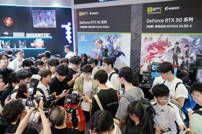 玩家们在NV区体验技嘉RTX50系顶级显卡,DLSS4技术加持,在《守望先锋》《鸣潮》游戏中画质细腻,帧率飞升,仿佛置身战场。