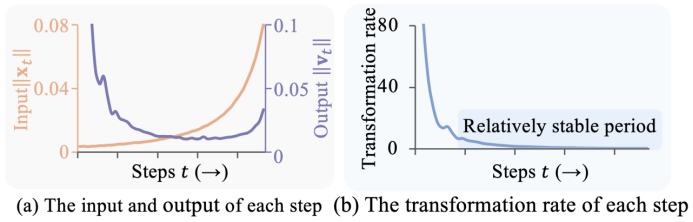 ,用于衡量当前输出对输入的敏感度。我们惊讶地发现,尽管整个模型的输入输出在时间步层面变化剧烈且呈现不同的变化模式,Kt在去噪后期却能保持相对稳定。