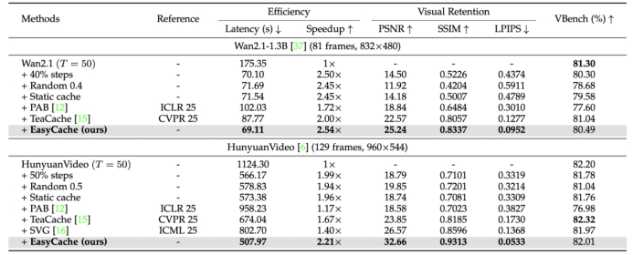 EasyCache 在 HunyuanVideo 上实现 2.2 倍加速,PSNR 提升 36%,SSIM 提升 14%,LPIPS 大幅下降,视频质量几乎无损。在 Wan2.1 上也取得了超过 2 倍的加速比。