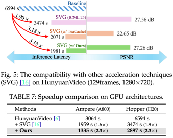 EasyCache 与 SVG 等稀疏注意力技术可叠加,平均可达 3.3 倍加速,总体推理时长从 2 小时缩短到 33 分钟。
