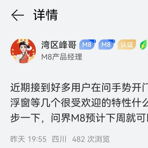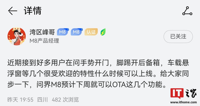IT之家 7 月 12 日消息,M8 产品经理 @湾区峰哥 昨日晚发文透露了“手势开门”、“脚踢开后备箱”、“车载悬浮窗”等功能特性的上线时间:问界 M8 预计下周就可以 OTA 这几个功能。