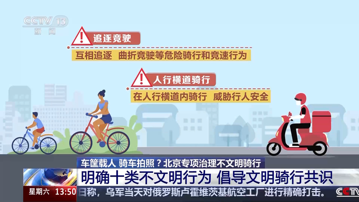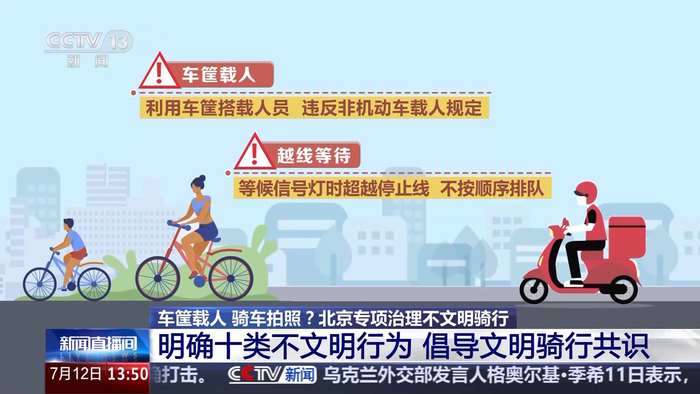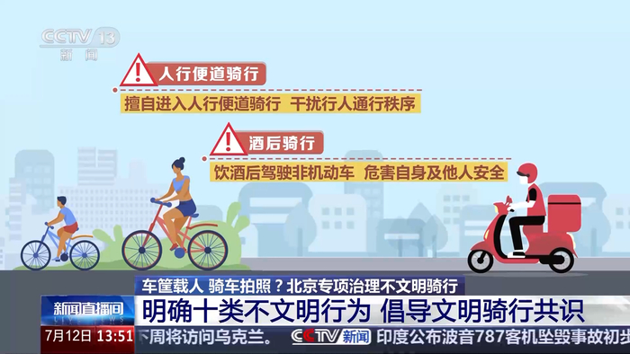 为进一步规范非机动车通行秩序,提升城市文明交通水平,北京市公安交管部门 7 月 9 日会同市文明办等部门在全市范围内开展非机动车不文明行为专项治理行动,聚焦追逐竞驶、人行横道骑行、越线等待等十类不文明行为加大治理力度与宣传引导,营造安全、有序、文明的道路交通环境。