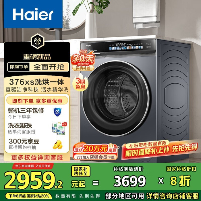 海尔洗烘一体机XQG100-HBE376XS,智能大容量省心之选