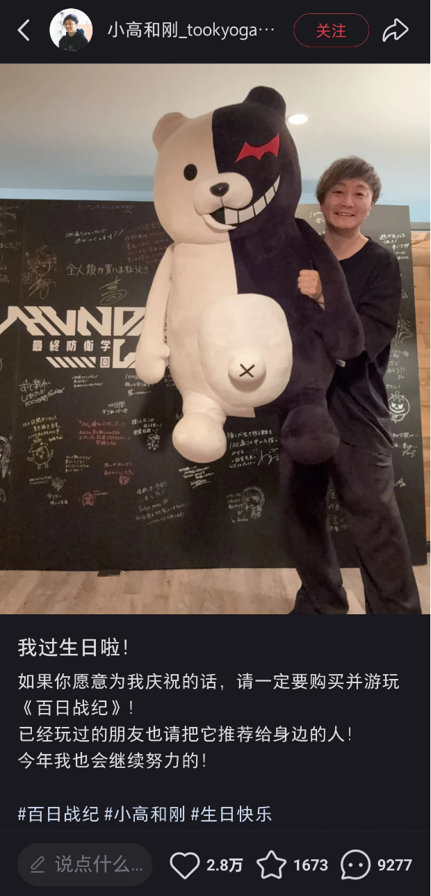 在几天前的生日,小高也仍旧不忘初心,借此宣传《百日战纪》。从获得的生日祝福来看,也俨然是在国内最受欢迎的海外游戏制作人之一了。