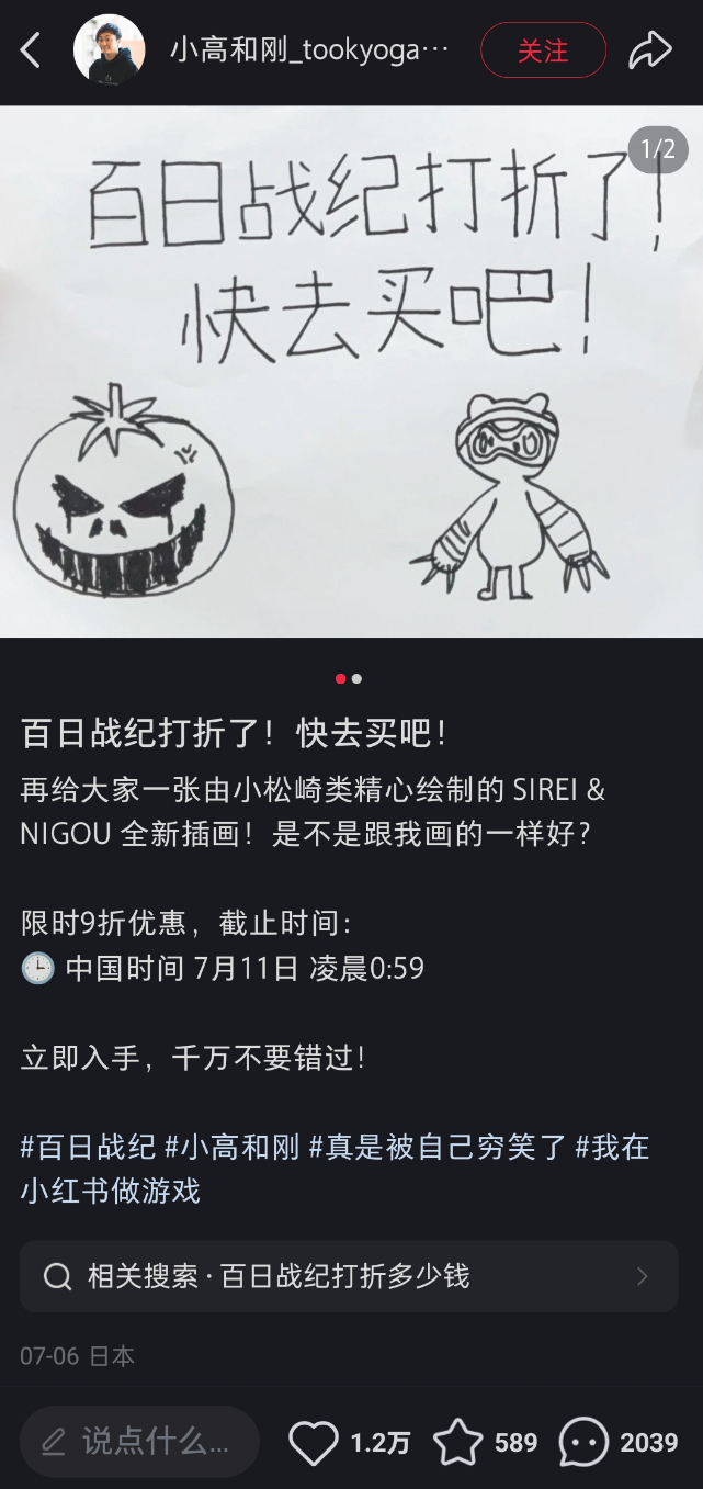 已经在小红书上有了10万粉丝的他,光是宣传游戏打折的消息就能有上万赞。