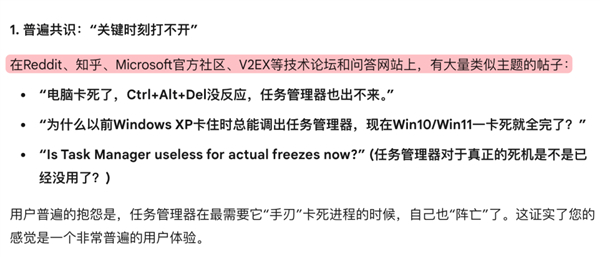 前两天,编辑部想做个选题,叫“任务管理器没小时候好用了”。我自己没找到佐证,就让 Gemini 帮忙搜搜,看网上有没有类似的讨论。