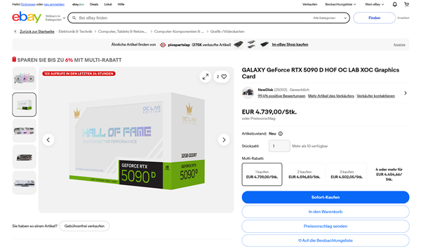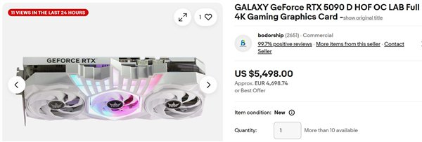 RTX 5090D HOF OC LAB则现身美国电商平台,标价5500欧元,折合人民币也是近4万元。