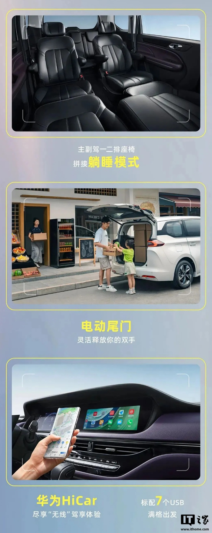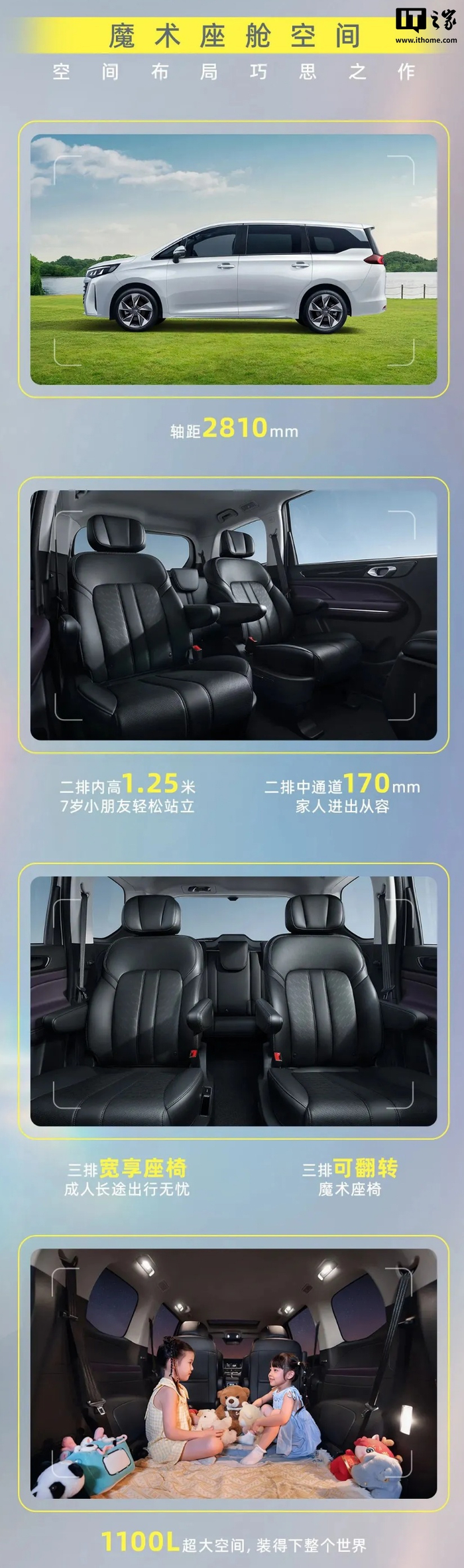 内饰方面,该车支持主副驾一二排座椅拼接躺睡模式、驾驶座椅 6 向电动调节、副驾驶座椅 4 向手动调节、三排座椅魔术翻转(IT之家注:可完全放平收纳)、双区自动恒温空调、8 扬声器高保真音响。