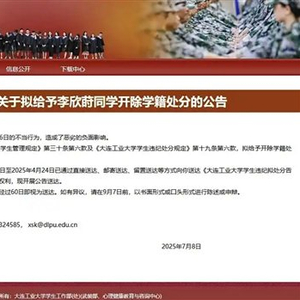 近日,大连工业大学学生工作部(处)网站发布“关于拟给予李欣莳同学开除学籍处分的公告”,鉴于其2024年12月16日的不当行为,造成了恶劣的负面影响,拟给予开除学籍处分。