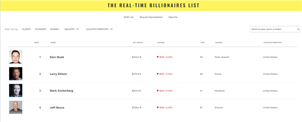 甲骨文创始人拉里·艾里森以2749亿美元身价居次席,Meta CEO和脸书创始人马克·扎克伯格以2476亿美元居第三名。