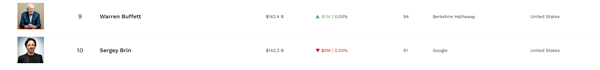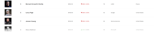 第七名就是NVIDIA创始人、CEO黄仁勋, 第八名是微软前CEO斯蒂夫·鲍尔默的1426 亿美元,第九名就是股神巴菲特的1424亿美元。另外一位Google创始人谢尔盖·布林以1423亿美元排名第十。