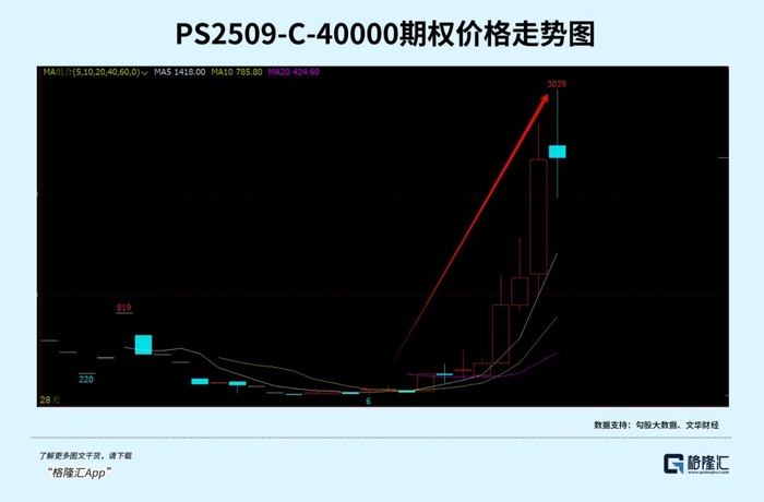 自7月1日召开中央财经委员会后,多晶硅期货市场反应最为迅猛。短短八个交易日,主力合约价格从3.2万元暴力拉涨至4.1万元上方,累计涨幅近30%。商品期货有11倍左右的杠杆,实际回报可能超300%,而期权市场更为暴力,深度虚值期权涨幅超100倍的也不少见。