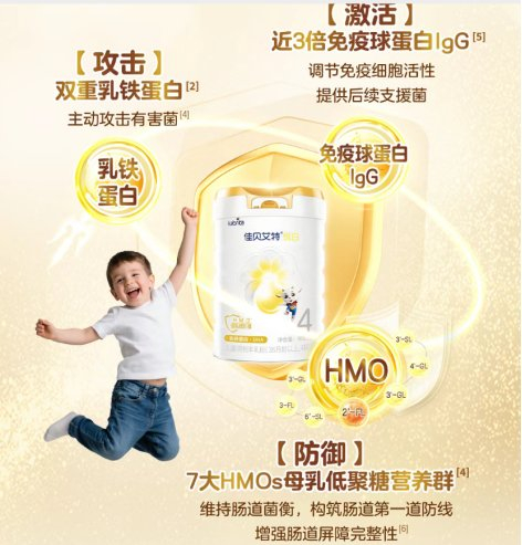 之所以选悦白4段,除了因为宝宝一直在喝悦白以外,最最重要的原因就是它的“防护组合拳”:近3倍免疫球蛋白IgG、双重乳铁蛋白,再加上7大HMOs营养群,联手打造了“三重进阶保护”。近3倍免疫球蛋白IgG可以助力增强免疫应答,调节免疫细胞活性,双重乳铁蛋白主动攻击有害菌,而7大HMOs可以帮助维持肠道菌群平衡,构建肠道防线,给孩子硬核的强大自护力!
