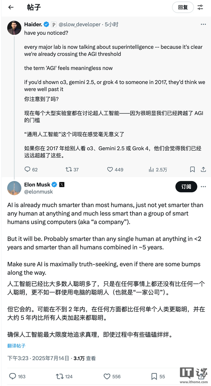 IT之家 7 月 14 日消息,马斯克今天在 X 平台上“疯狂输出”,刚刚在回复一名博主 Haider 有关 AGI 的观点时表示,AI 已经“比大多数人聪明得多”了,但并没有“在任何领域都超越任何个体人类”。