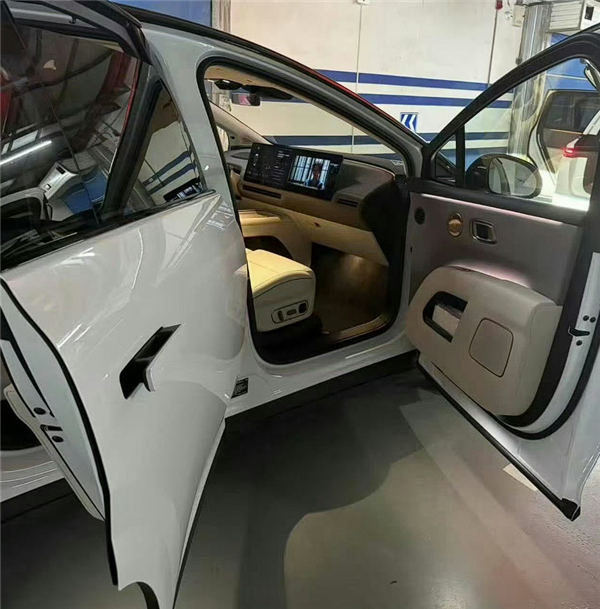 此次曝光的实车图可以看到其车灯已经点亮,一体式星环灯位于挡风玻璃下方,两侧则是家族化的黄色点缀灯,开启智驾功能后可以变身为小蓝灯