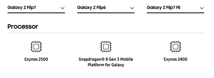 只不过比起外在,今年 Z Flip7 身上最耐人寻味的一点,其实是它的处理器。根据三星过往的习惯,除了韩版和欧版之外,在全球其他大部分地区销售的旗舰机型如 S、Z、W 系列都会使用高通处理器,然而今年的 Z Flip7 打破了这个惯例: