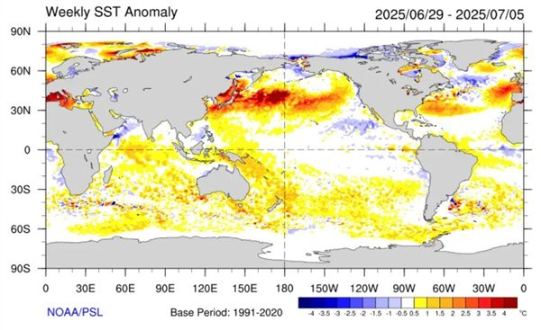 6 月 29 日-7 月 5 日全球海表温度偏离常年同期的距平图(填色,单位:℃)