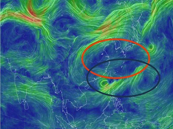 2025 年 7 月初副热带高压位置(红色圈出),而常年同期平均的大致位置以黑色椭圆标出。底图来源:earth.nullschool.net
