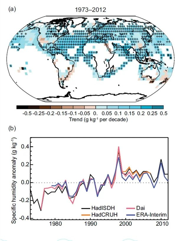 上图:1973-2012 年全球陆地水汽含量变化趋势(填色,单位:每十年 g/kg 增长率);下图:全球陆地平均绝对湿度变化趋势。图片来源:联合国政府间气候变化专门委员会(IPCC)