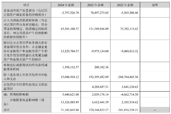 例如,2023年净利润7690.5万元中,有高达1.22亿元政府补助、1.92亿元的营业外收入以及7049.73万元非流动资产处置损益等。