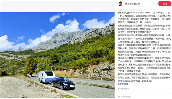 博主在西班牙自驾游整辆房车被偷:价值50万 找回希望渺茫